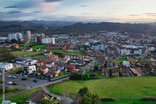 Fototapeta premium Pola de Siero village, aerial view, Siero council, Asturias, Spain