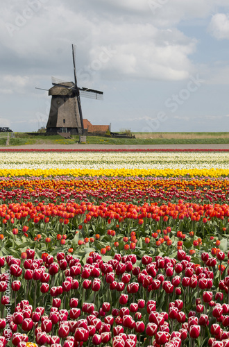 Naklejka premium Pola tulipanów z wiatrakiem