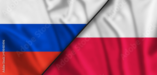 Fototapeta premium Poland and Russia two flags textile cloth, fabric texture. 3d illustration.