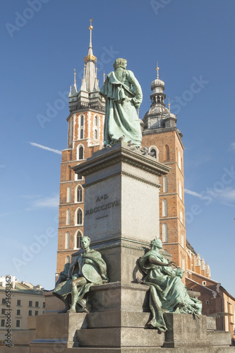 Obraz premium Poland, Krakow, Mickiewicz Monument, st Mary Curch Towers, Midday