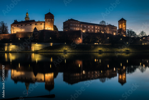 © Laura, Fototapeta premium Poland, Krakow: Royal Castle of Wawel by morning blue hour with reflection in water