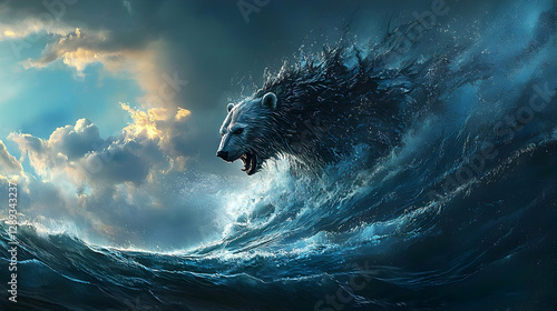 Obraz premium Polar bear emerging from ocean wave, dramatic sky, environmental impact...