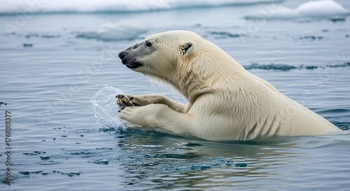 Naklejka premium Polar Bear in the Arctic Waters: A majestic polar bear navigates the icy waters of the Arctic, embodying the resilience of nature in the face of environmental challenges.