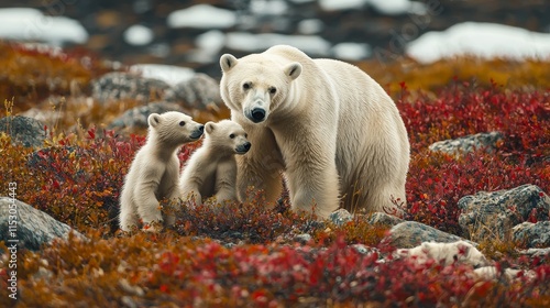 Fototapeta premium Polar Bear Mother and Cubs in Arctic Tundra