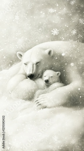 Fototapeta premium Polar bear mother cuddling her adorable cub in a snowy landscape