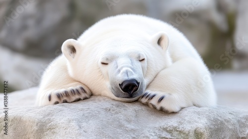 © Kaminashi Nozomi, Fototapeta premium Polar Bear on Rock Naturalistic Style High-Resolution Soft Lighting Close-up View Sleeping Paws Grey Stone Background Cool White Mood Conservation Awareness