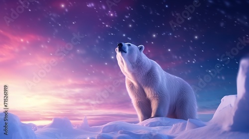 Fototapeta premium Polar bear snowflakes and skyWinter landscape with animals landscape mock up...