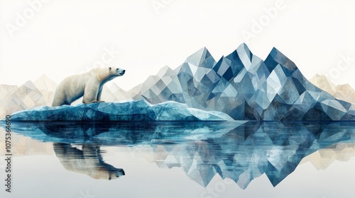 Naklejka premium Polar Bear Standing on a Melting Iceberg with Geometric Mountains in the...