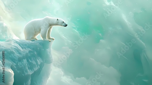 © Natchanok, Naklejka premium Polar bear standing on ice cliff edge with soft light and abstract background in pale green