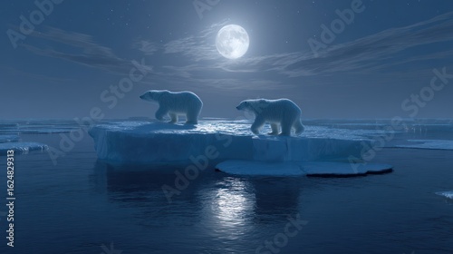 © Chenda, Naklejka premium Polar bears navigating a glowing ice island beneath a pale moon