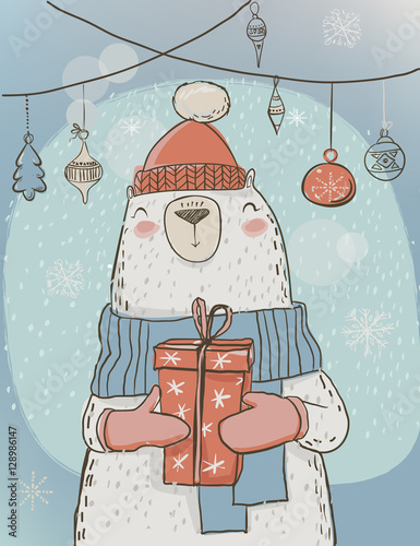 © cofeee, Fototapeta premium polar christmas bear with present box