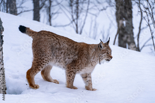© Stefano, Obraz premium Polar Park Bardu, Norway - 23 February 2025 - A beautiful lynx walks in a winter landscape