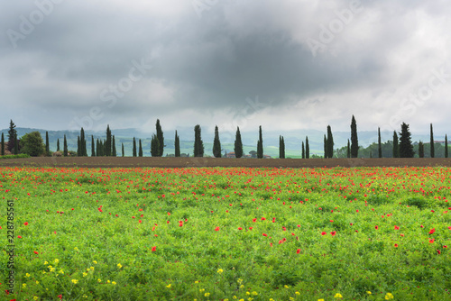 Fototapeta premium Pole kwitnienia czerwonych maków i cyprysów, Włochy, Toskania