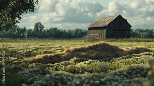 Fototapeta premium Pole pełne siana z dużymi stertami w pierwszym planie, a w tle spokojnie stojąca stodoła, tworzące sielankowy, spokojny krajobraz.