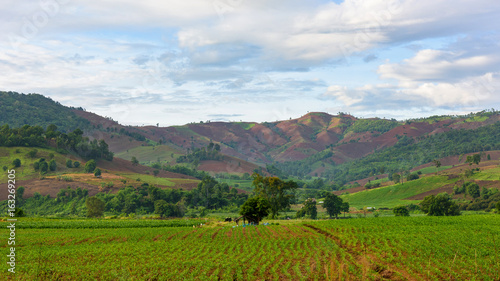 © bouybin, Obraz premium Pole ryżowe i chmura na tle gór, Tajlandia