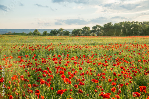 © vdeineka, Fototapeta premium Pole świeżych maków o zachodzie słońca na południu