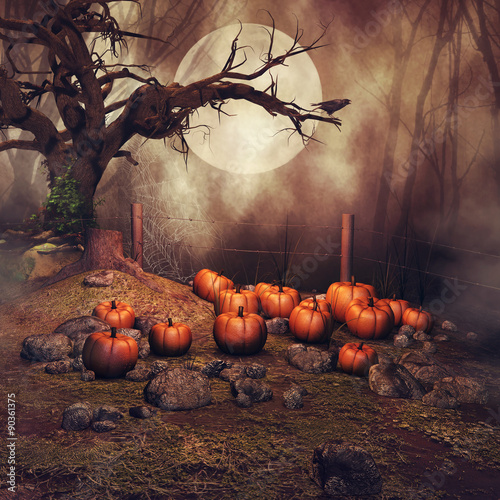 © Obsidian Fantasy, Fototapeta premium Pole z dyniami, starym drzewem i krukiem na tle lasu i księżyca w pełni