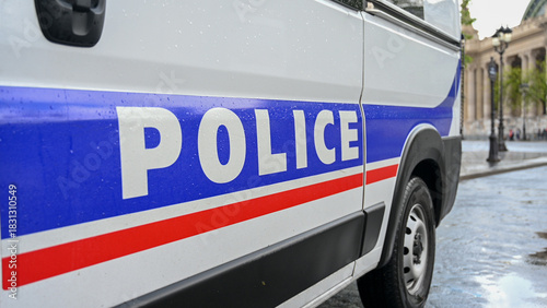 © Ajdin Kamber, Obraz premium Police car on the street. Side view of a police car with the lettering "Police". Police patrol vehicle parked on the street. Law enforcement vehicle