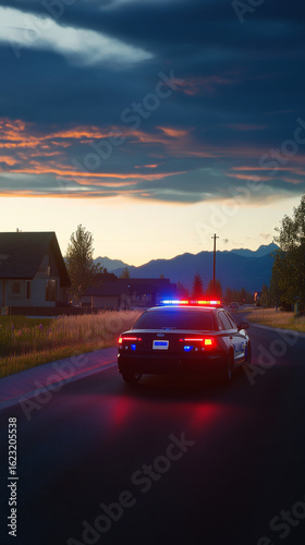 © Faziljan, Fototapeta premium Police car with flashing lights cruises down a dark road. Sunset colors illuminate the sky and distant mountains.