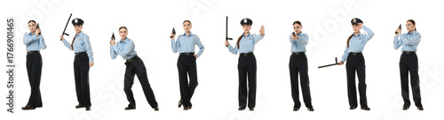 © New Africa, Obraz premium Policewoman in uniform on white background. Collage of different portraits