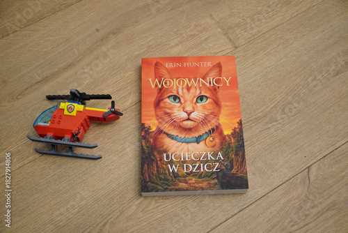 © Everyday Frame, Fototapeta premium Polish edition of Warriors: Into the Wild book with a toy helicopter on wooden floor