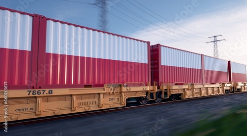 © Negro Elkha, Obraz premium Polish export. Running train loaded with containers with the flag of Poland.