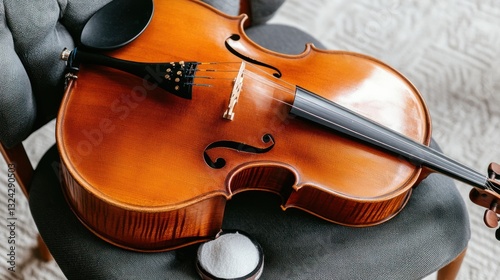 © khamz, Fototapeta premium Polished Cello Resting On Chair Soft Lighting