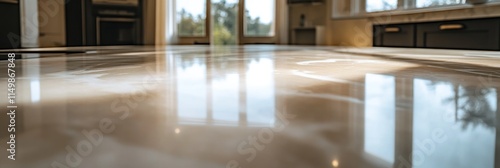 Fototapeta premium Polished concrete floor reflecting kitchen and window.