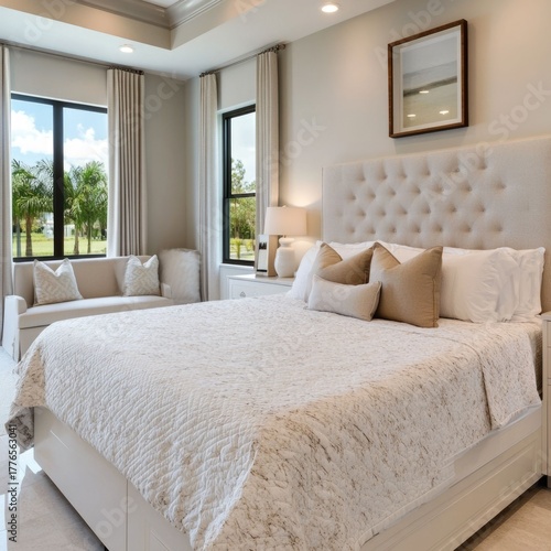 Fototapeta premium Polished granite counter in a soft lit bedroom featuring neutral color tones...