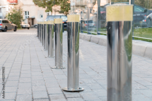© Galka3250, Fototapeta premium Polished Silver Bollards Line a Paved Pathway in Urban Setting