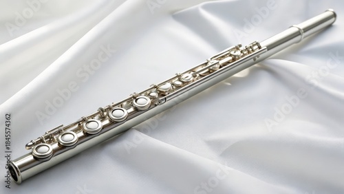 © Hakim, Fototapeta premium Polished Silver Flute Rests on White Fabric
