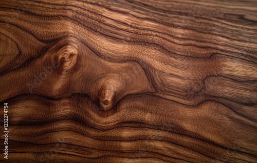 © Ulyana, Naklejka premium Polished Walnut Wood Texture Close-Up Background with Intricate Grain Patterns and Natural Knots