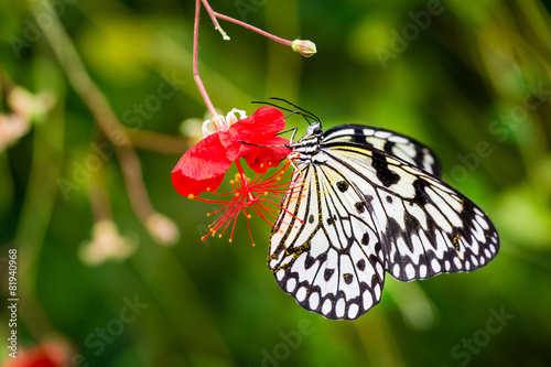 Fototapeta premium Pollen covered black and white butterfly on red flower
