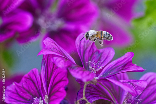 © grahamspics, Fototapeta premium Pollen Laden Wasp on purple Flower.