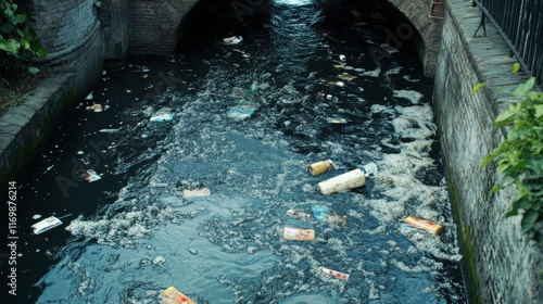 © Fauzerene, Obraz premium Polluted Canal with Dramatic Lighting and Educational Labels