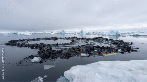 © BOJOShop, Fototapeta premium Pollution and icebergs floating in the ocean with a rainbow sheen on the water