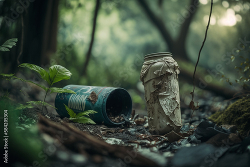 © Lubov, Obraz premium Pollution environment. Plastic garbage in forest. Save planet. Ecological problems. Long decaying waste in nature. Rubbish in the nature. generated ai