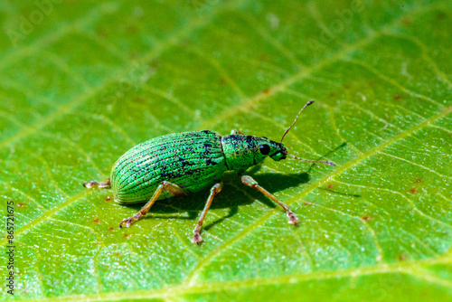 Fototapeta premium Polydrusus formosus - green shiny beetle weevil on a green leaf