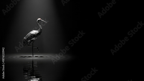 © Natalia, Fototapeta premium Polygonal Crane in Dark Water 3D Art Dark Background Water Reflection. Concept featuring crane, polygonal, 3d art, dark background, water reflection.