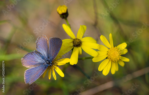 © lotusblüte17, Fototapeta premium polyommatus icarus common blue butterfly on a senecio inaequidens or narrow-leaved ragwort