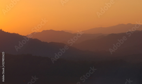 Fototapeta premium Pomarańczowe niebo nad zamglonymi górami wokół Luang Prabang, Laos. Widok ze...