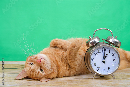 Obraz premium Pomarańczowy imbirowy tabby kot kłaść na drewnianej stołowej do góry nogami łapach w powietrzu, zielony tło obok staromodnego budzika ustawiającego 1 godzina AM. Czas letni. Wiosna do przodu. Spadać.