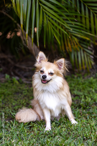 © SailingAway, Fototapeta premium Pomeranian Chihuahua dog sits and smiles in a tropical yard