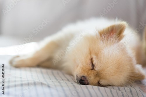 © Urbanscape, Fototapeta premium Pomeranian dog sleeping on the sofa, with copy space