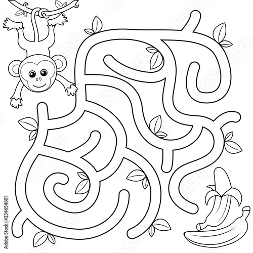 © alka5051, Obraz premium Pomóż małpie znaleźć drogę do banana. Labirynt. Gra labirynt dla dzieci. Czarno-biały ilustracja wektorowa do kolorowania książki