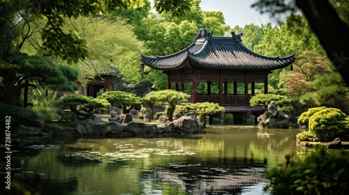 Fototapeta premium Pond in Japanese Garden With Pagoda in Background