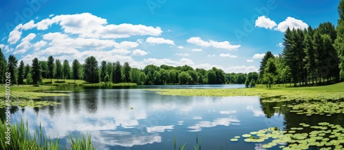 © HN Works, Fototapeta premium Pond on a beautiful summer day. Creative banner. Copyspace image