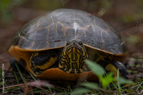 Fototapeta premium Pond slider turtle hidden amidst foliage