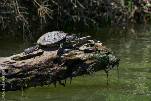 Fototapeta premium Pond Slider Turtle on Log While Paddling the Tennessee River in Knoxville, TN