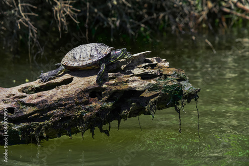 Obraz premium Pond Slider Turtle on Log While Paddling the Tennessee River in Knoxville, TN